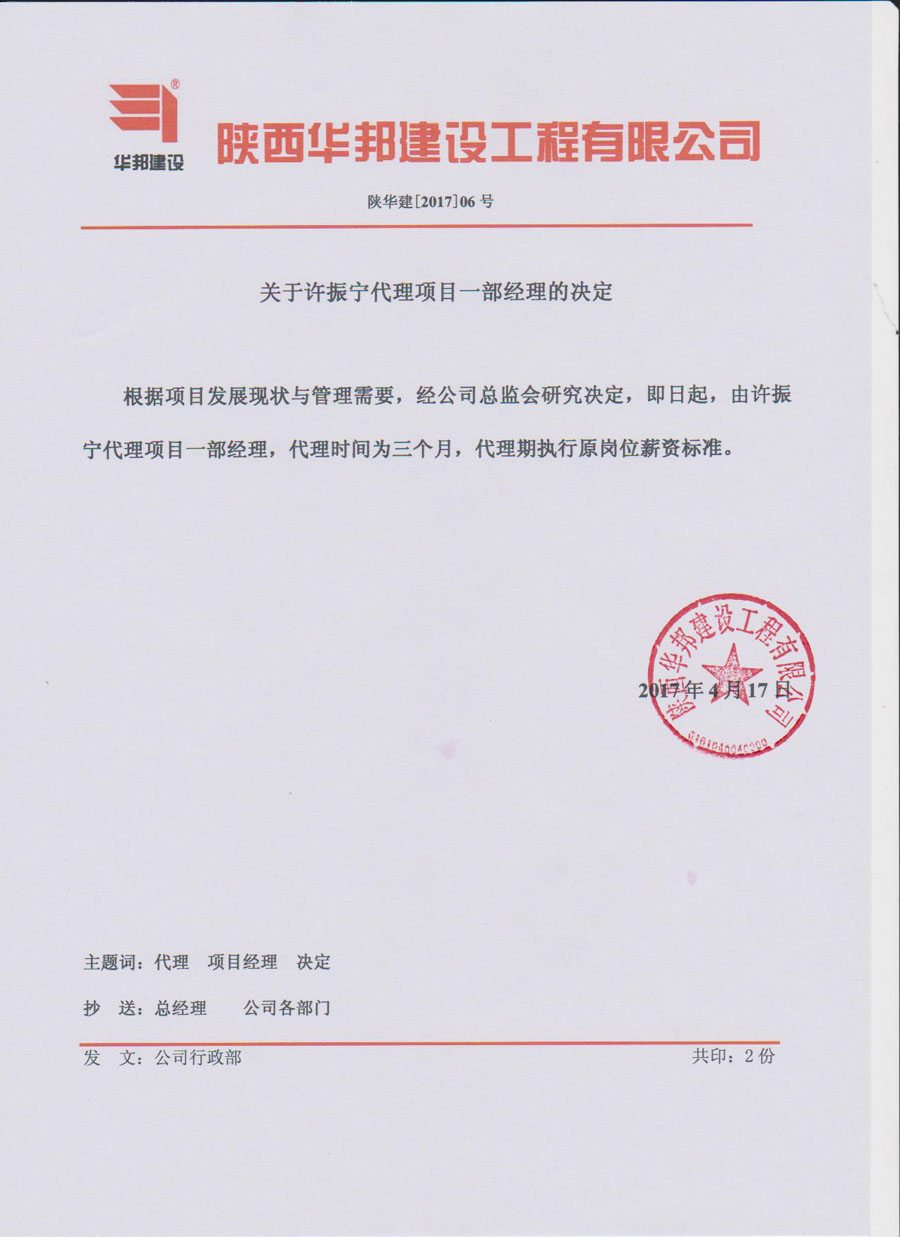 關(guān)于許振寧代理項(xiàng)目一部經(jīng)理的決定