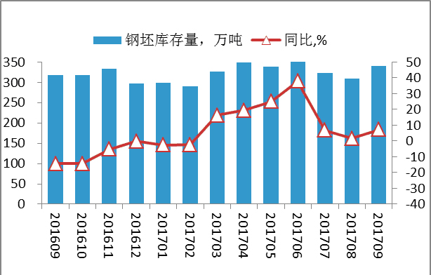 圖6 重點鋼鐵企業(yè)各月末鋼坯庫存量及同比