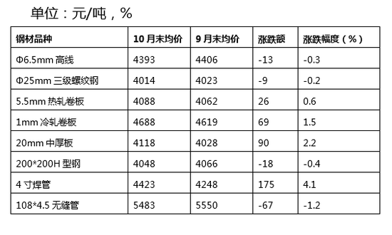 蘭格鋼鐵云商平臺監測的8大鋼材品種10大城市均價顯示,截至10月31日,各品種價格走勢對半分化,高線、三級螺紋鋼、H型鋼和無縫管有所下跌,其中無縫管跌幅最大,為1.2%;而熱軋卷板、冷軋卷板、中厚板、焊管有所上漲,其中焊管漲幅最大,為4.1%(詳見表1)。