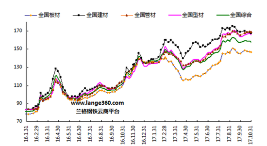 10月份,國內鋼鐵市場呈現高位震蕩的局面。據蘭格鋼鐵云商平臺監測數據顯示,截至10月31日,蘭格鋼鐵全國鋼材綜合價格指數為157.8,較上月末上升0.3%,年同比上升41.1%。其中,建材價格指數為167.8,較上月末下降0.8%,年同比上升46.6%;板材價格指數為146.5,較上月末上升0.9%,年同比上升34.4%;型材價格指數為165.6,較上月末上升1.2%,年同比上升48.9%;管材價格指數為169.0,較上月末上升1.8%,年同比上升46.6%(詳見圖1)。