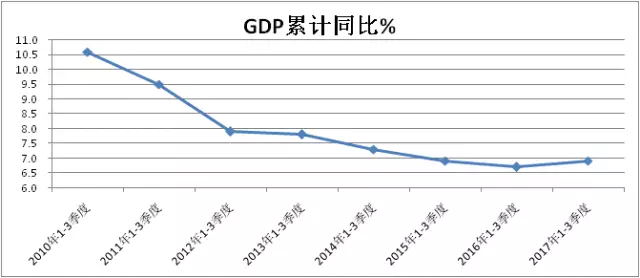 一是2017年1~3季度國內生產總值(GDP)為59.33萬億元,同比增長6.9%,增速較2016年同期提高了0.2個百分點。這是2010年以來GDP累計增速首次出現回升(見圖1)。同時,GDP增長結構不斷優(yōu)化,實體經濟發(fā)展明顯向好,工業(yè)GDP增長6.4%,分別比2015年同期、2016年同期高出0.3個百分點、0.4個百分點。