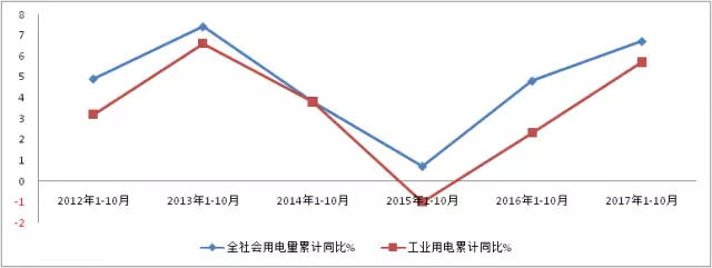 ▲ 圖3 近6年各年度1-10月份全社會用電量累計同比、工業(yè)用電累計同比(%)