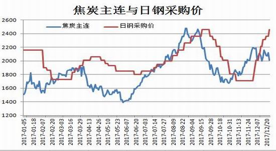 2017年,國內焦炭期現貨價格走勢大起大落,但相較于年初重心繼續上移,由于環保安全檢查使得焦化行業的開工受到限制,從而造成貨源供應出現階段性偏緊局面。特別是進入6月份,鋼鐵行業清除地條鋼效果明顯,利好刺激下鋼材價格扶搖直上,高利潤驅動下鋼廠開足馬力生產,原料需求旺盛,焦炭價格持續攀升,焦炭期貨指數于8月29日創出年內新高2493元/噸,相較于6月份低點1365.5元/噸,漲幅超80%。但隨著鋼廠及焦化廠庫存大增,焦炭價格大漲明顯透支需要紅利,于9月中旬至10月底出現一波35%深度回調。據統計數據顯示,天津港準一級冶金焦由年初2190漲至2017年底2495,漲幅達14%。