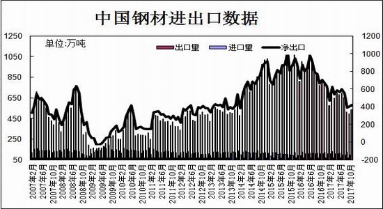 據海關總署公布的數據顯示,2017年1-11月份我國鋼材進口量為1210萬噸,1-11月鋼材出口量為6996萬噸,1-11月份鋼材凈出口量為5786萬噸,去年同期凈出口量為8918萬噸。2017年鋼材出口量持續萎縮,一方面是歐美等發達國家頻繁針對中國進行“雙反”調查,另一方面則是國內鋼材價格堅挺出口優勢不明顯。