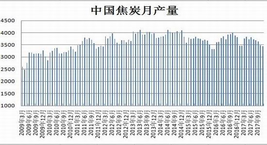 2017年煤炭行業調控政策已經由2016年的“去產能,限產量”逐漸調整為“保供應,穩煤價”,因此煉焦煤產量相較于2016年同比出現增長,但仍低于2015年產量。而2017年由于粗鋼產量同比增加對于焦炭需求增速明顯提高,受環保限產影響焦化廠供給端卻同比出現下滑,據統計數據顯示,2017年1-11月份國內焦炭產量為40048萬噸,同比下降2.2%,從月產量分析,焦炭產量受環保政策及鋼廠需求變化而變。其中1-2月份及四季度焦炭產量分別受需求淡季及采暖季限產影響,平均月產量在3500萬噸之下,而其余月份產量均在3650-3800萬噸區間,因鋼價走高粗鋼產量高企,焦化廠利潤回升開工率逐步上移。