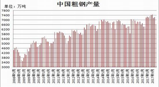 據國家統計局數據顯示,2017年1-11月中國粗鋼產量為77798萬噸,去年同期粗鋼產量為74141萬噸,同比增長4.9%。粗鋼產量同比增長,鋼價重心卻逐步上移,更關鍵因素則是全國去除落后鋼鐵產能(包括取締“地條鋼”產能)已經超過2億噸,這大幅削弱了鋼材實際供應量的產能基礎。加之年內鐵腕環保力度的加大,鋼廠庫存屢創新低。這就表明,有增無減的供應壓力,主要是被更為旺盛的國內需求增長所消化吸收。