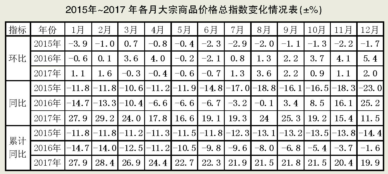 2017年12月份,國內經濟運行平穩,大宗商品市場需求增加,供應持續下降,供需銜接基本正常。綜合來看,當前國內大宗商品市場基本回歸穩中趨升的運行態勢。2017年12月份,大宗商品價格繼續上漲,環比上漲2.0%,漲幅較2017年11月份擴大0.9個百分點,顯示出大宗商品價格整體處于上升通道中;同比上漲11.5%,漲幅收窄3.9個百分點。2017年,大宗商品累計平均價格同比上漲19.9%,比2017年初上漲4.0%。