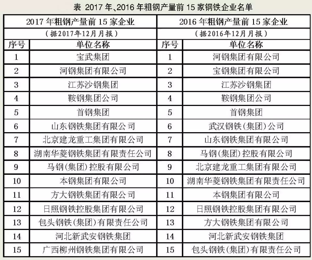 根據2017年12月份的《中國鋼鐵工業統計月報》,2017年粗鋼產量前15家的鋼鐵企業見下表。2017年粗鋼產量前15家的企業名單與2016年相比略有變化,僅新增了廣西柳州鋼鐵集團有限公司。2016年粗鋼產量排名第2位的寶鋼集團有限公司與排名第6位的武漢鋼鐵(集團)公司于2017年1月份起產量均并入寶武集團(昆明鋼鐵股份公司除外)。寶武集團的成立,不僅使新集團粗鋼產量躍居全國首位,亦使廣西柳州鋼鐵集團有限公司2017年粗鋼產量排名得以上升至第15位。