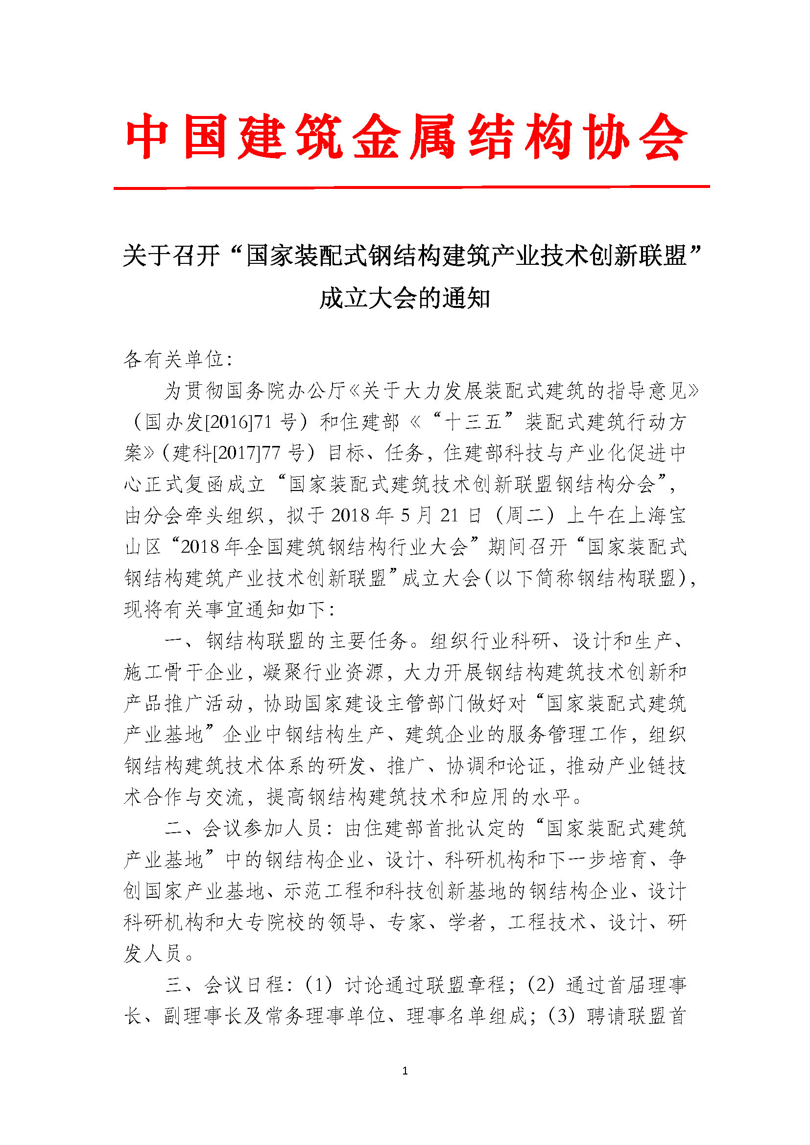 關(guān)于召開“國(guó)家裝配式鋼結(jié)構(gòu)建筑產(chǎn)業(yè)技術(shù)創(chuàng)新聯(lián)盟”成立大會(huì)的通知