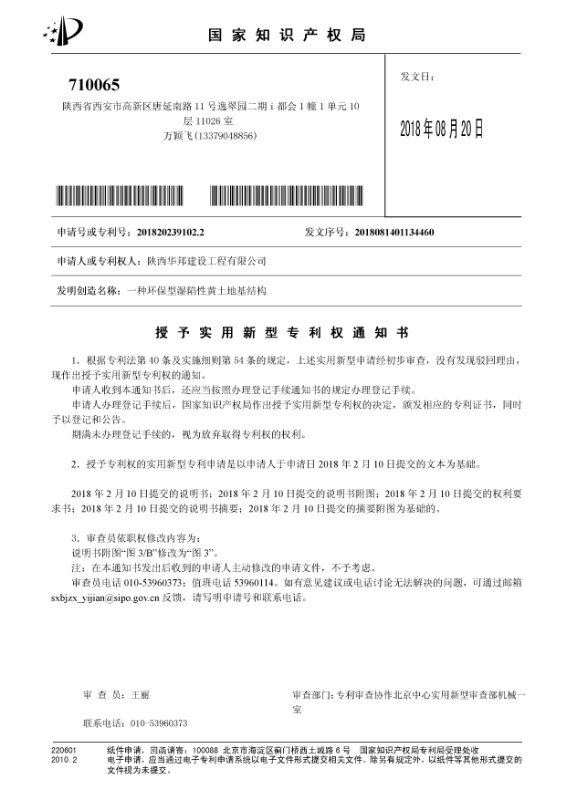 華邦建設“環保型濕陷性黃土地基結構”授權專利