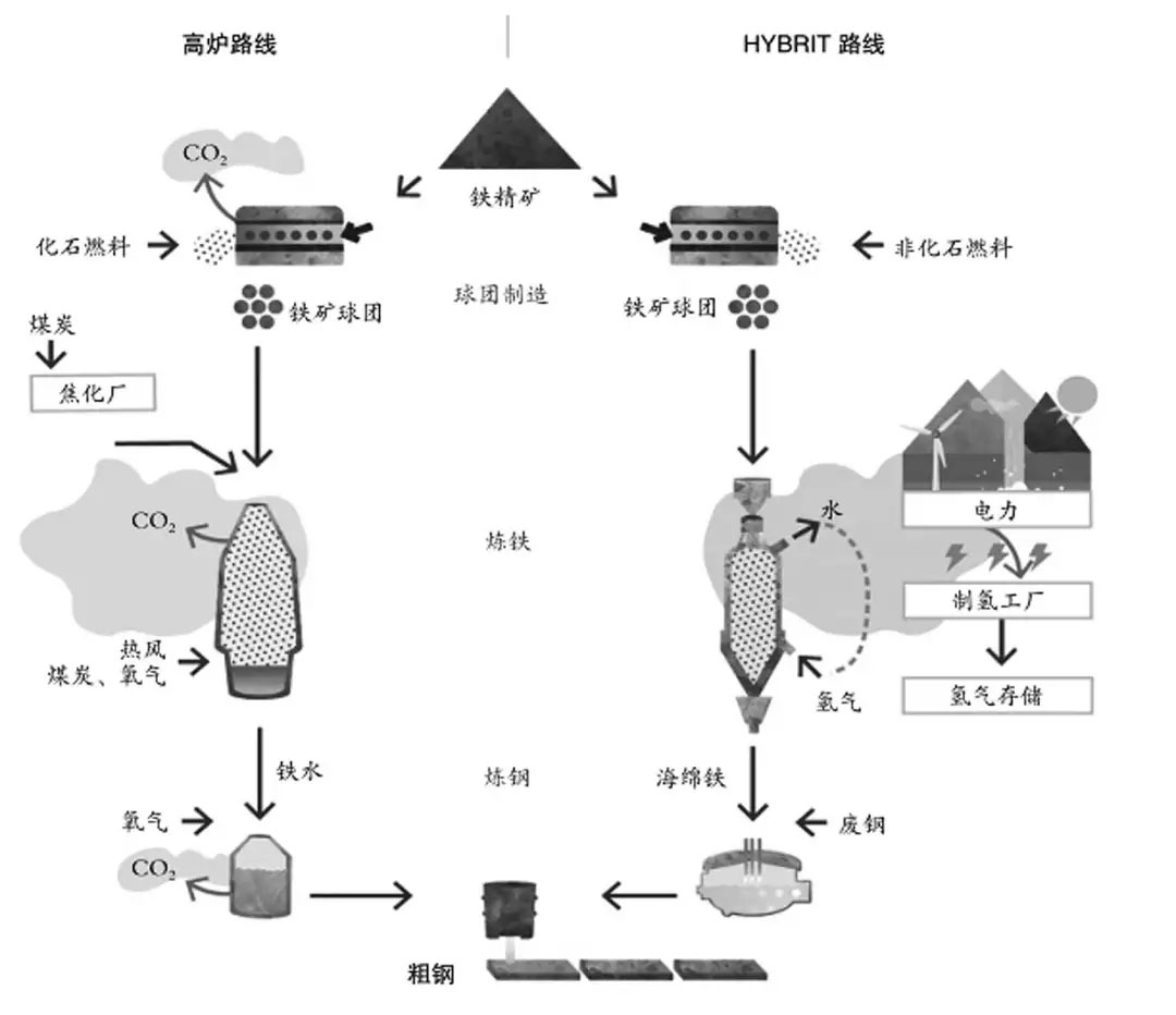 瑞典能源署向HYBRIT項(xiàng)目提供的資助資金主要涵蓋兩個(gè)子項(xiàng)目。一是利用氫氣直接還原進(jìn)行鋼鐵生產(chǎn)初步研究項(xiàng)目。該研究項(xiàng)目的目標(biāo)是開發(fā)出一種以純氫氣為球團(tuán)礦生產(chǎn)海綿鐵的還原劑的技術(shù)(圖1是傳統(tǒng)高爐工藝和HYBRIT工藝的比較)。二是球團(tuán)、燒結(jié)工藝的非化石能源加熱初步研究項(xiàng)目。該研究項(xiàng)目有著雙重目標(biāo),即在減少現(xiàn)有球團(tuán)廠的溫室氣體排放的同時(shí),設(shè)計(jì)出一種全新的造塊工藝。