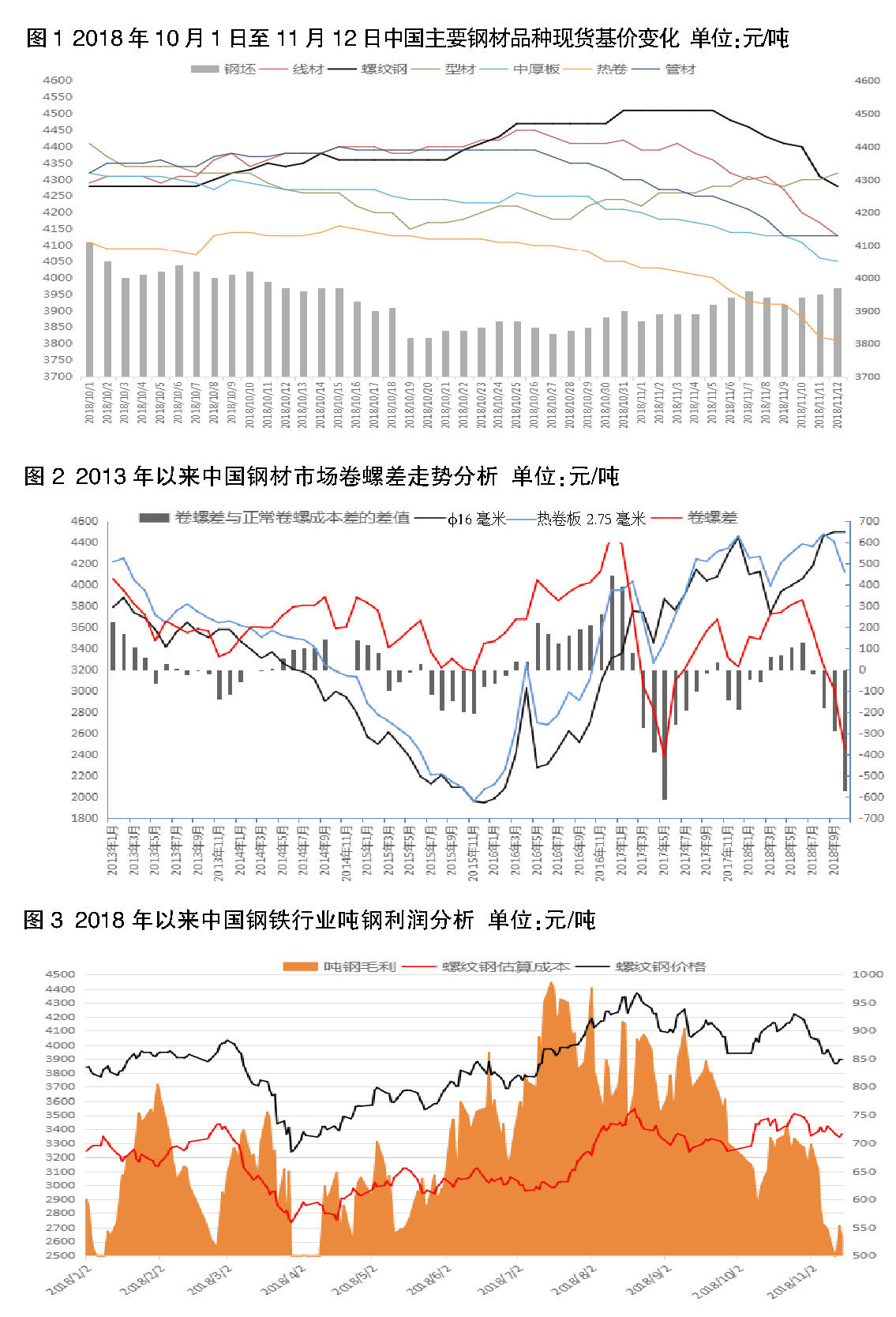 10月份以來,中國鋼材價格呈現先高后低的走勢。10月前期,多數品種鋼材價格震蕩上行;10月下旬,除螺紋鋼因供給缺口繼續上行外,其他品種價格在下游需求不暢的制約下走出下行態勢。11月后,在螺紋價格陡降的帶動下,幾乎所有品種的鋼材價格均轉而向下。僅11月上旬,螺紋鋼現貨價格就下跌了近6%。
