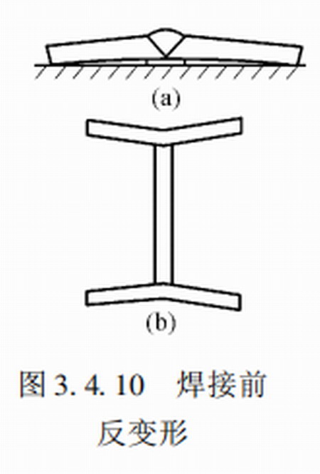 2、采用反變形法減小焊接變形或焊接應(yīng)力。事先估計好結(jié)構(gòu)變形的大小和方向,然后在裝配時給予一個相反方向的變形與焊接變形相抵消,使焊后的構(gòu)件保持設(shè)計的要求,例如下圖3.4.10所示為焊前反變形的設(shè)置。