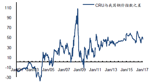 國內外鋼材價差是導致出口變動的最重要原因,過去二十年都高度相關。過去一年多來,隨著我國鋼價上漲盈利好轉,鋼企在國內就可以順利消化資源,加之鋼價看漲氣氛好,出口有所減少。本來鋼價是自然供需靈敏指標,但供給側改革使得鋼價虛高,從而將進一步影響2017 年的出口。