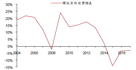 建筑鋼材與房地產投資更為相關,過去三年螺紋實際消費量增速分別為2.25%、-12.9%、-3.40%,這已經不是用表外鋼材就能解釋的了,因為2015 年小鋼企幾乎全部停產,2016 年政策限制他們又不能像往常一樣正常生產。