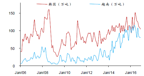 2016 年我國鋼材出口10843 萬噸,同比下降3.5%。從過去一年來政府表態和實際執行力度看,今年供給側改革仍可維持一定力度,這也意味著今年的需求即使不樂觀,但鋼價仍可虛高,從而降低出口競爭力,影響出口量。
