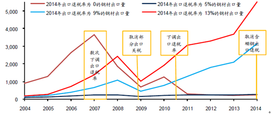 國內外價差決定出口是否有利可圖,但退稅可以改變是否有利。我國鋼材出口大約有400 個左右的稅則號(也就是分類),每一種稅則號對應不同的出口退稅率。目前我國有四種鋼材出口退稅率,分別為0%、5%、9%、13%,我們按這四種退稅率將過去十多年來不同稅則號的鋼材出口量合計在一起,可以看到,鋼材出口之所以大增,更多是退稅率的引導。過去10 多年來,退稅率為0%和5%的鋼材出口沒有增加,增量幾乎全部來自9%和13%退稅率的鋼材出口。國內外價差決定出口是否有利可圖,但退稅可以改變是否有利。我國鋼材出口大約有400 個左右的稅則號(也就是分類),每一種稅則號對應不同的出口退稅率。目前我國有四種鋼材出口退稅率,分別為0%、5%、9%、13%,我們按這四種退稅率將過去十多年來不同稅則號的鋼材出口量合計在一起,可以看到,鋼材出口之所以大增,更多是退稅率的引導。過去10 多年來,退稅率為0%和5%的鋼材出口沒有增加,增量幾乎全部來自9%和13%退稅率的鋼材出口。
