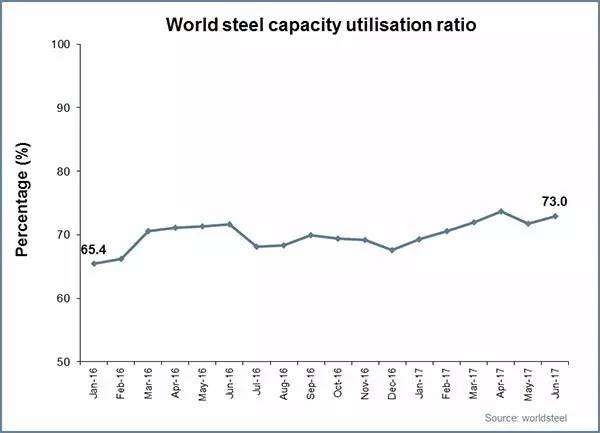 2017年6月全球67個國家的粗鋼產能利用率為73.0%,同比提高1.4個百分點,環比提高1.3個百分點。
