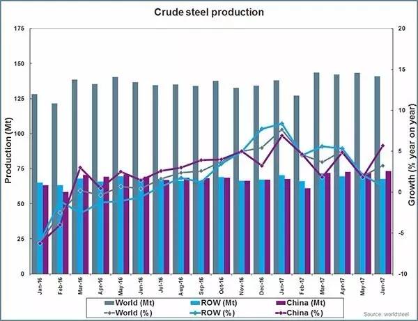 2017年上半年全球的粗鋼產量為8.36億噸,同比提高4.5%。亞洲地區2017年上半年粗鋼產量為5.768億噸,同比提高4.8%。歐盟地區2017年上半年產量為8610萬噸,同比提高4.1%。北美地區上半年粗鋼產量為5740萬噸,同比提高2.4%。獨聯體2017年上半年全球產量為4970萬噸,同比下降2.5%。