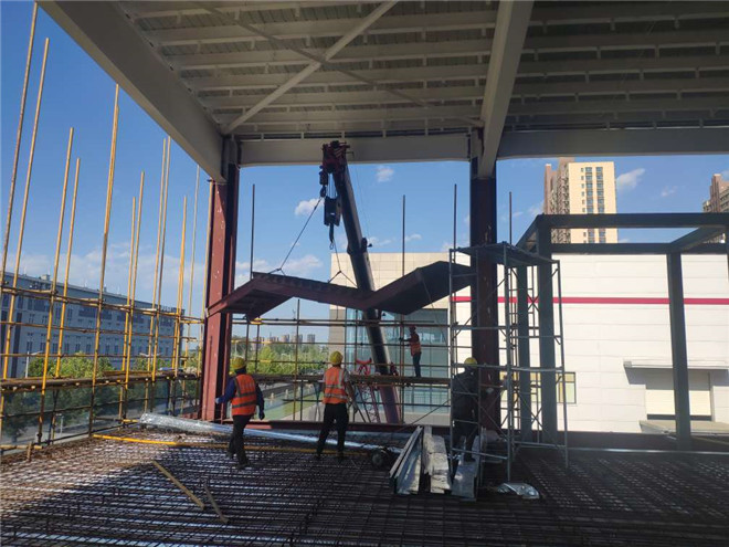 隆基樂葉鋼結構廠房樓梯安裝和屋面外板壓制